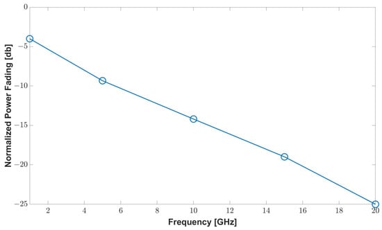In the proposed system, the length of the SMF in the system being discussed is 10 km, which is a relatively smaller length, and the frequency of the intermediate frequency carrier was relatively low, i.e., 1.14 GHz. As a result, the effects of power fading were not noticeable. Additionally, the use of zero-chirp Mach-Zehnder modulators (MZM) eliminated inter-mixing and the generation of second-order intermodulation distortion (IMD2). This was also true for the sub-terahertz 6G system, where the use of only a single sideband in fibre-wireless transmission eliminated the effects of RF fading. Figure 9 shows below the power fading for the range of 1 GHz to 20 GHz.
