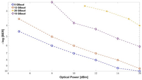 Profile of increasing baud rate for varying optical power in terms of BER.