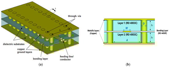 Designed Substrate-Integrated Coaxial Line (SICL). (a) Top-view diagram; (b) side-view diagram.