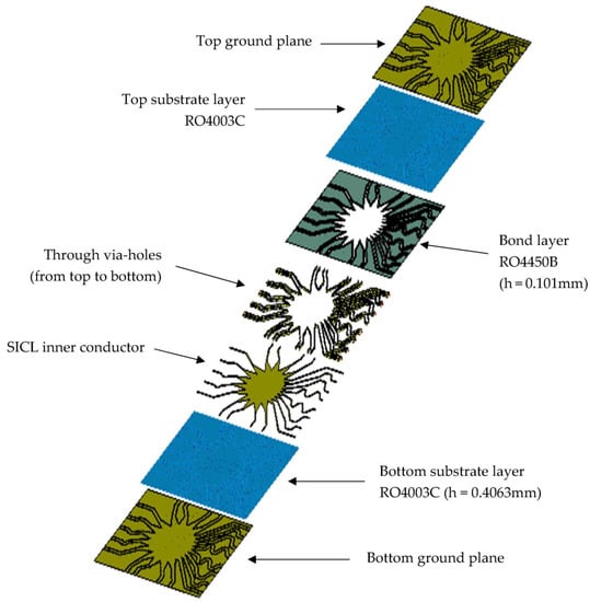Once the SICL line is designed, the optimized values are then used to design the SICL-based RL BFN. The RL designed using the method discussed earlier is sandwiched between two grounded substrate layers. The bond layer of RO4450B of thickness 0.101 mm is placed in between the two substrates to avoid reflections and to provide the required structural rigidity. After designing the RL using SICL technology, the layered structure, shown in Figure 4, is simulated and then compared with the same design in the MSL.
