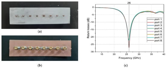 The front and bottom views of the fabricated 1 × 8 antenna array with the soldered SMA connectors are shown in Figure 8a,b. The return loss of up to 27 dB for the antenna ports is achieved which proves good impedance matching of the designed antenna array as shown in Figure 8c.