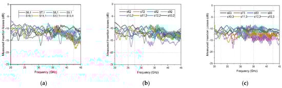 Measured insertion losses of the fabricated SICL-based RL at array ports when (a) beam port 1 is excited, (b) beam port 2 is excited, and (c) beam port 3 is excited.