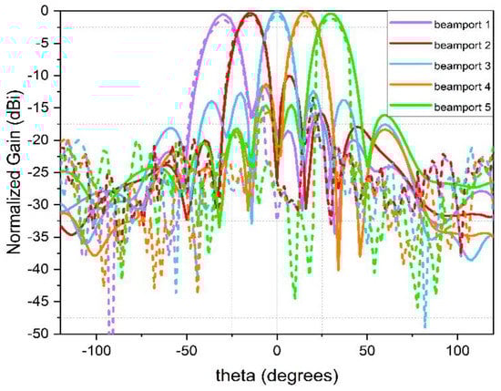 The measured radiation patterns shown in Figure 11 show good agreement with the simulated results. The minor differences in the gain patterns can be associated with cable losses and dielectric losses which are measured separately up to 2.1 dB (not shown here). The beam is successfully steered to the pre-defined angles using the designed SICL RL beamformer. The beam steering angles are −30, −15, 0, +16 and +30 degrees when the input beam ports 1–5 are excited, respectively, as verified through the measurements.