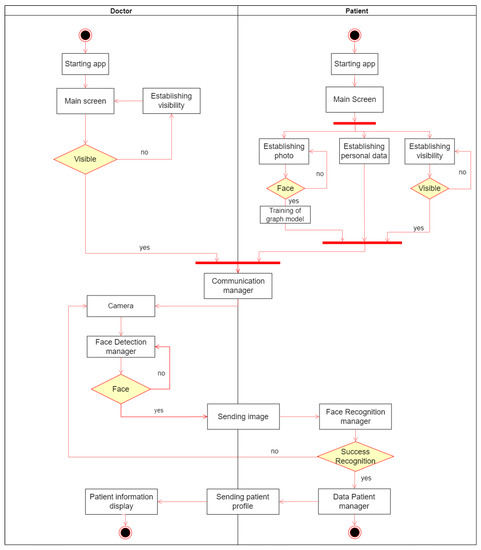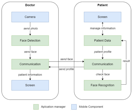 - When the doctor wants to obtain a patient’s profile, he will access the mobile component camera through the application to take a picture of the patient’s face. Once done, the picture is sent to the Face Detection manager to perform face detection. Once it detects a face correctly, it sends the image to nearby patients via the Communication manager. They check the image received matches their profile picture through the Facial Recognition manager. If the facial recognition is successful, the user obtains their information through the Patient Data manager and sends it back to the doctor with whom they have made the connection so that they can view it. Otherwise, the doctor would return to the point of taking a picture with the camera to test with another patient, because the analyzed patient does not have the application installed, does not have the connection active, or the profile picture is not well taken.
