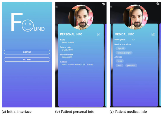 This section implements a case study (the images of the person were generated with AI by using DALL-E 2 (https://openai.com/dall-e-2/, accessed on 17 October 2022)) for an Android mobile application. This application is called Found and is based on the proposed architecture. Found can be used by both profiles: doctor and patient. Note that we have proposed this “two-in-one” solution to optimize resources and leverage the same application for both profiles. Figure 3a shows the initial screen of the application where each type of user can choose their profile type. Note that this is a prototype, so each user will choose the corresponding profile type.