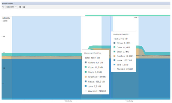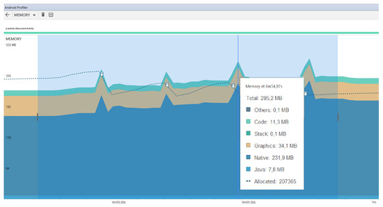 Secondly, Figure 5 and Figure 6 show an extract of the memory consumption of both profiles. The x-axis shows the execution time in seconds and the y-axis, the amount of memory consumed in Mb. Figure 5 shows an excerpt of the memory consumption of the doctor device. As we can see in the figure, when the doctor’s device is not performing any analysis is when the consumption band remains horizontally stable. The average consumption is around 200 Mb. However, when he performs an analysis, requiring the use of the camera and the face detector, this can be seen in the peaks shown in the figure, implying an increase in consumption up to 285 Mb. Figure 6 shows the memory consumption extract of the patient’s device. When the application is waiting to receive the photograph, the memory consumption remains above 190 Mb. However, when it receives a photograph and has to run facial recognition and obtain the data to send it, the consumption increases to about 220 Mb as shown in the figure, and a “hill” is produced, which is the time frame that executes the face recognition. Concerning the memory consumption of both profiles, we can conclude that the consumption is not too high; currently, most devices on the market have at least 6 Gb of RAM, as is the case with the devices we have used. In the worst case, which is when the doctor uses the camera to take the picture and analyze the face (285 Mb), it means the consumption of only 4.75% of the RAM memory of the device, a very low percentage.