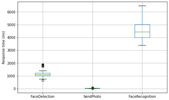 Thirdly, we show the results obtained from the performance parameters. Figure 7 shows a box-plot diagram with all the parameters described for the evaluation. For the parameter Send Photo, the variability is very small, obtaining values between 30/50 ms, remaining constant in all cases, and being the most stable of the three. Regarding the parameter Face Detection, it has a little more deviation (800/1800 ms) with some outliers. However, the median is in the center of the box so the distribution is symmetrical. Finally, the parameter Facial recognition and sending profile is the process that takes by far the longest and has the most deviation, being in the range of 3400 ms and 6500 ms. Therefore, if there is a bottleneck, we would have it in the part of facial recognition and data collection.