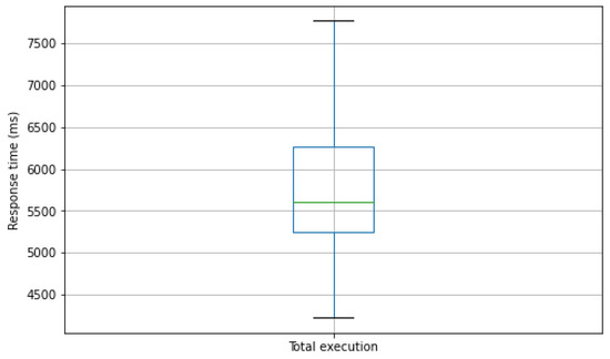 Finally, we also show the average execution time of the entire process, from the moment the patient’s photograph is taken until the patient’s profile is received by the physician, i.e., the sum total of the three evaluation parameters in each execution. Figure 8 shows the box-plot diagram with this information. It can be seen that the average execution time for the 60 tests performed is between 4220 ms and 7772 ms, with an average of 5795.95 ms. Considering that the deviation caused by the main bottleneck is in the facial recognition component, the global response times suppose acceptable results, considering that these are environments where connectivity is limited and data availability is critical. Thus, it could be interesting to optimize this aspect in the future.