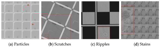 Wafer surface defect detection is a key link in the semiconductor-manufacturing process. It can provide timely feedback of product-quality information, determine causes of defects in accordance with each defect type and location, and correct operations as early as possible to avoid huge losses [1]. Wafer surface defects can be divided into the following categories: (1) Particles: they may be caused by dust in the air that adheres to the wafer surface or impacts of external sharp objects, and they are mostly round and characterized by small scale; (2) Scratches: most of them are caused by improper instrument operation, and they are linear and exhibit large spans and discontinuity; (3) Ripples: they are mainly caused by film interference due to the coating defects of each layer, and they are characterized by wavy edges and low contrast with the background; (4) Stains: they are irregular in shape and large in area due to the residual dirt of the etching solution. These defect types are shown in Figure 1. With the rapid development of the semiconductor industry, chip structure is becoming smaller, and the wafer manufacturing process is becoming increasingly complex. Many detection methods are no longer applicable [2,3]. Therefore, wafer surface defect detection research is crucial to improvement of industrial production efficiency and meeting the development needs of the industry. How to improve detection accuracy and reduce false and missed detection has become the focus of wafer detection research at this stage.