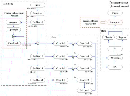 The task of wafer surface defect detection requires high defect-positioning accuracy, so this study proposes an enhanced Faster RCNN model with an improved network structure. The overall framework of the improved network is shown in Figure 2, where the red boxes are improved parts. The network structure consists of four modules, which are backbone, neck, head, and postprocess.
