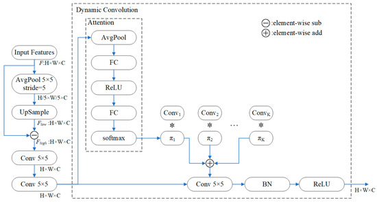 To make the network focus on effective defect-feature information and suppress invalid background information, the high-frequency feature map needs to be convolved, and useful information must be extracted from it. The use of a dense convolution module increases the computational overhead considerably because of the large scale of the high-frequency feature map. Therefore, this study introduces dynamic convolution to replace ordinary convolution; the former can effectively reduce the number of layers of ordinary convolution and demonstrate the same feature extraction capability. The high-frequency feature map, Fhigh, is fed into two ordinary convolutions and one dynamic convolution to extract useful feature information.
