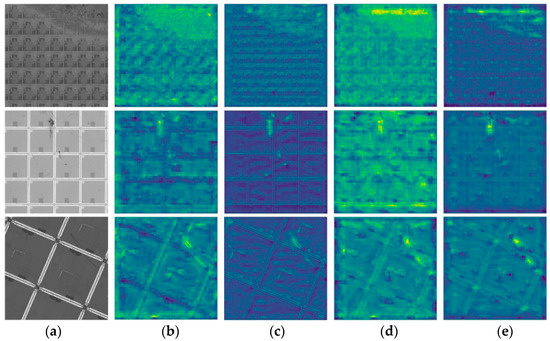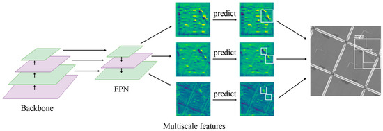 Scratch defects are characterized by large spans and discontinuity due to image background interference, console failure, and other reasons. The object-detection model detects not only complete scratches but also discontinuous scratches, which reduce the accuracy of the model and affect the subsequent operation of the industrial production process. The reason for this phenomenon is related to the FPN structure of the model. To improve multiscale object-detection ability, object-detection models usually integrate the FPN to extract multiscale features, adopt shallow feature maps to detect small-scale objects, and apply deep feature maps to detect large-scale objects. As shown in Figure 4, feature maps with different depths are extracted and visualized in the Faster RCNN network model. Figure 4 shows that the receptive field of the deep feature map is large, and it can capture information from a long distance. In addition, the preset anchor-box scale is also large, so complete scratch defects can be easily detected. In a shallow feature map, the receptive field and preset anchor-box scale are both small, so only part of any defect can be detected. In addition, the semantic information of a deep feature map is rich, but its detail information is insufficient, leading to low position accuracy of predicted boxes. Meanwhile, shallow feature maps are rich in detail information, so bounding boxes predicted via a shallow feature map are highly accurate.