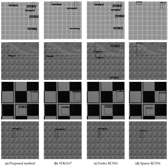 In addition to the quantitative results, we also display some qualitative results in Figure 6, which indicates that the proposed method can effectively detect various types of defects and has high positioning accuracy. For discontinuous scratch defects, the proposed method can successfully detect complete scratches through predicted box aggregation processing while Faster RCNN figures out the defect with multipredicted boxes. For small particles and stains with complex textures, the method extracts high-frequency features through the feature enhancement module, which can effectively enrich semantic information and obtain accurate detection results. Several missed detections occurred with YOLOv7 and Sparse RCNN. The proposed method showed better performance in the cases above, as shown in Figure 6.