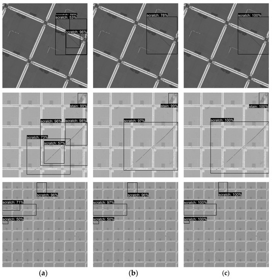 To verify the effectiveness and superiority of this method in wafer surface defect detection, it was compared with mainstream object-detection methods. The models used in the comparative experiment included the proposed method, RetinaNet [26], Faster RCNN [17], Sparse RCNN [27], and YOLOv7 [28]. The experimental results are shown in Table 1, which indicates that the proposed method is superior to the other methods in terms of accuracy, but its detection speed is poor. The proposed method is a two-stage network structure. The bounding boxes are classified and regressed twice, and the feature enhancement module is introduced, resulting in poor detection speed and a small FPS value. Compared with Faster RCNN, although the detection speed of the proposed method decreased by 0.58 frames/s after addition of the feature enhancement module and the predicted box aggregation method, the accuracy for each category greatly improved; in particular, the average precision for scratch defects increased by 15.8%. Sparse RCNN uses parameter learning to replace preset anchor boxes. Its detection performance for small objects, such as particles, is poor, which may be due to wide distribution of particle defects. One hundred groups of learned anchor box parameters are insufficient to cover all possible positions. For improved inference, YOLOv7 selects no feature map with a sampling ratio of 4, so it demonstrates poor performance in particle defects. In our method, five scale feature maps were selected, and feature enhancement modules were added to improve the feature description ability of the network model for various types of defects. The accuracy for each category increased. In conclusion, compared with other object-detection models, the proposed method has a higher detection accuracy and can effectively detect different types of defects, but its detection efficiency is poor. For wafer surface defect detection, which requires special attention to accuracy, the proposed method has obvious advantages.