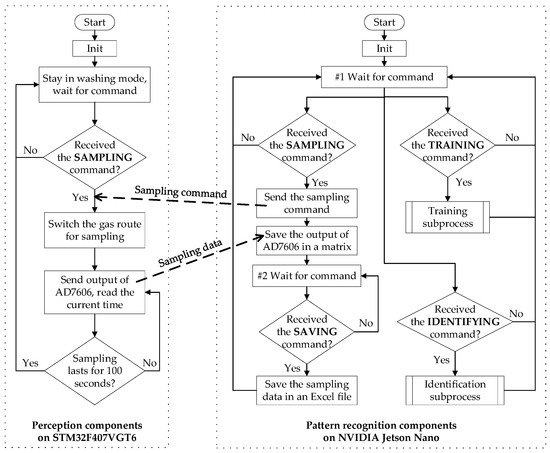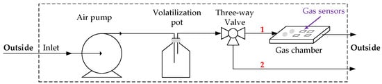 - Gas route in the sampling mode: As preparation for sampling, a fixed volume of LVC sample was dripped into the volatilization pot in advance. The fast airflow can accelerate the LVC volatilization process and drive the gaseous LVC towards the three-way valve. Through gas route branch 1, gaseous LVC can get into contact with the gas sensors mounted in the gas chamber and stimulate the sensor responses.