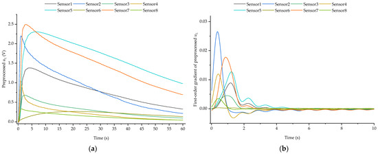 - For both methods, the normalized voltage peaks were generally more important than other characteristics. On the contrary, the normalized times of the maximum first-order gradient were slightly less important than other characteristics, although the importance of feature 38 in Figure 10b existed as an exception. It can be concluded that the peak values contain more distinguishing information about the different perfume constituents. The maximum first-order gradient, which characterizes the time of maximum rising velocity, is less correlated with the stimulant perfumes.
