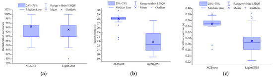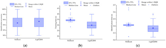 - By pushing the “Identification” button in the bottom-right corner of Figure 8a, an individual identification process can be activated. As mentioned in the previous paragraph, the identification process follows the sampling process, and uses the newly collected samples as input. Moreover, as the identification tool, a previously trained and saved ML model should be selected from the model lists before pushing the “Identification” button. During the identification process, the process status is shown in the blank space at the left of the “Identification” button. Finally, the identification result is displayed in the blank space above the model lists.