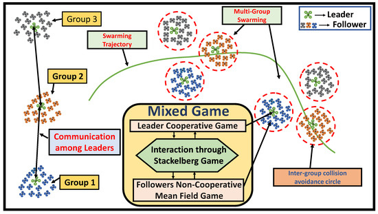 To address these challenges, a mixed game theory is proposed and utilized to formulate the optimal swarming problem for large scale multi-agent systems. The overall structure of the developed mixed game theoretical swarming is shown in Figure 1. First, the LS-MAS is reformulated as a multi-group large-scale leader–follower system by dividing a large number of agents into several subgroups with a leader and a large number of followers in each group. The objective of each group is to achieve optimal distributed swarming behavior. To achieve desired swarming, a mixed game theory was developed by seamlessly integrating (1) the cooperative game [22,23] to ensure the collective swarming behavior among multi-group leaders, where the leaders from each group cooperate with other leaders to maintain the overall multi-group swarming while avoiding inter-group collision, (2) the Stackelberg game [24,25] to connect the leader with its corresponding followers, where a set of coupling functions is introduced by the Stackelberg game in order to maintain leader–follower cohesion in each group, which guarantees that the followers from each group successfully achieve the swarming behavior of their respective leaders, and (3) the mean field game (MFG) [26,27,28] between non-cooperative followers used to continue the collective swarming behavior from the leaders to large-scale followers. The MFG deal involves the “Curse of Dimensionality” and the communication complexity problem of a traditional cooperative game. A probability density function (PDF) (i.e., mass) is employed in the MFG to replace the large number of agents’ state information. Since the mass function has the same dimension as the state space, it eliminates the correlation between rising computing complexity and the agents’ increasing population by reducing the dimension of the cost function.