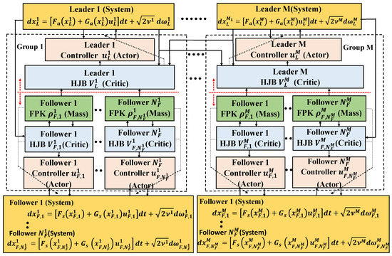 In this section, a hierarchical learning-based actor–critic–mass algorithm (see Figure 2) is developed and explained in detail. It includes (1) multi-agent actor–critic neural networks (NNs) to obtain the cooperative game-based distributed optimal swarm control for multi-group leaders and (2) actor–critic–mass-based decentralized control for large-scale followers within the same game to obtain the mean field game-based swarming. Additionally, the Stackelberg game integrates distributed swarming control for leaders and decentralized control for followers into a unified framework and further obtains the overall distributed intelligent swarming control for multi-group leader–follower systems.