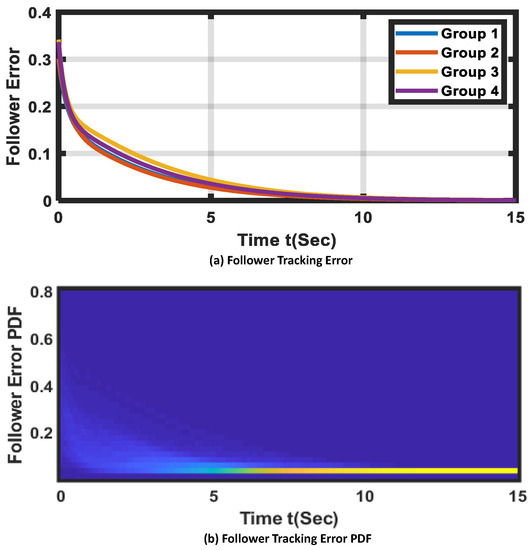 where is the probability density function (PDF) of the large-scale followers’ state in the ith group, is the expected value, and and are the weighting matrix and weighting parameter, respectively. Now, the leader–follower swarming coupling function is
