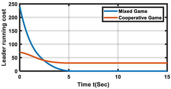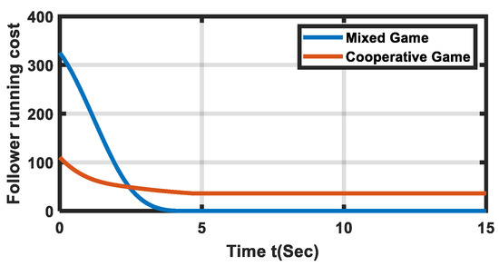 Figure 9 shows the performance of the developed algorithm in terms of the running cost for the leader in group 1. From Figure 9, it is clear that the performance of our approach against the cooperative multi-agent centralized approach was better after a certain amount of time. In the beginning, the cost of the cooperative game-based optimal solution was lower. However, the developed algorithm slowly outperformed the cooperative game-based algorithm. The main reason for this is that the cost function of cooperative centralized swarm control is penalized for high amounts of communication between the leader and the followers in the same group. Similarly, the performance of the developed mixed game theory-based distributed swarm control algorithm for the follower in the same group is shown.