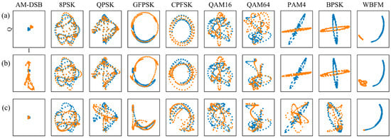 Comparison of constellation of modulated signals after three time series transformations. The original signal constellation diagram is highlighted in blue and the converted signal constellation diagram is displayed in orange. (a) Scaling; (b) magnitude warping; (c) time warping.