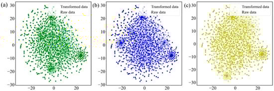 Visualization of the augmented comparison plot of the RadioML2016.10b dataset using t-SNE. The hollow shape is the generated time series and the solid shape is the original time series. (a) Scaling; (b) magnitude warping; (c) time warping.