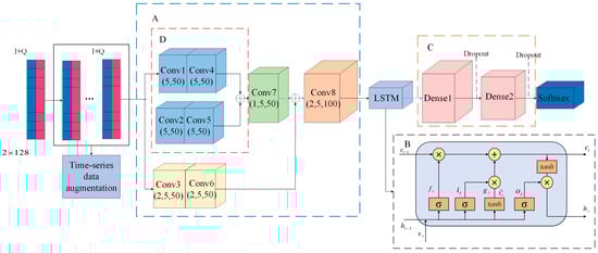 The convolution module consisted of four two-dimensional convolutions (Conv3, Conv6, Conv7, and Conv8) and four one-dimensional convolutions (Conv1, Conv2, Conv4, and Conv5), as shown in Figure 3. The size of each one-dimensional convolution kernel was 5 and the number was 50; the size of the two-dimensional convolution kernel was 1 × 5 and 2 × 5 and the number was 100. The activation function selected was ReLU. First, the I/Q signal was divided into independent I-channel and Q-channel data and then the three sets of data were imported into the convolution module to extract the multi-channel and independent channel features of the I/Q signal. We connected these features and entered Conv7 to determine the spatial correlation. The convolutional module outputted a feature map of 124 × 100 as an input to the LSTM layer, which consisted of 128 memory cells and outputted 128 eigenvectors as an input to the dense layer. To avoid overfitting, both dense layers employed a dropout, whose parameter was set to p = 0.5. The extracted signal features were integrated by the dense layers and finally the classification was completed by the SoftMax function.