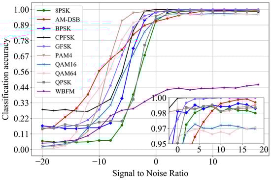 All the following experiments were operated in a python environment using the Google TensorFlow (2.4.1) platform for the computations related to the neural network models. The dataset was first partitioned into the training set, the test set, and the validation set at a ratio of 3:1:1, respectively; the optimizer of Adam was selected, the batch size was set to 128, and the number of iterations was 30. Figure 4 shows that the recognition accuracy of the modulated signals was related to the SNR. With an increase in the SNR, the recognition accuracy also increased. When the SNR was greater than 5 dB, all signals—except WBFM, QAM16, and QAM64—were correctly identified and the recognition accuracy was close to 98%. When the SNR was 0 dB, except for WBFM, the recognition accuracy of the other signals was basically more than 92%. Among them, PAM4 had the best recognition effect and the strongest anti-interference ability against noise. When the SNR was greater than −5 dB, the recognition accuracy reached more than 90%, which was significantly higher than other types of signals. The results showed that the method based on DL could be applied to a modulation recognition task under a low SNR.