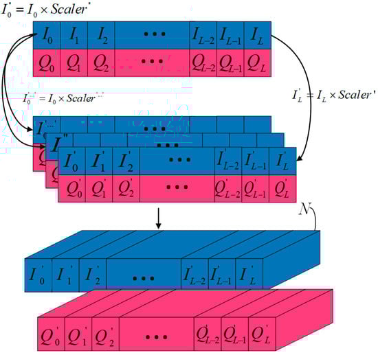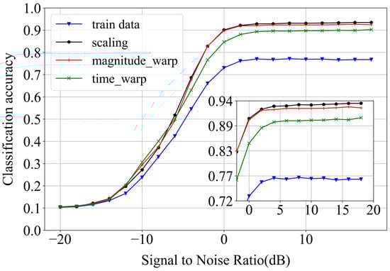 The three data augmentation methods of scaling, magnitude warping, and time warping were extended according to the equal scale factor N = 4. Taking scaling as an example (the transformation process is shown in Figure 5), a scaler was randomly generated by the Gaussian distribution and the original I/Q was multiplied with it to obtain a new set of I/Q signals as new signals. The process was repeated N times to amplify the dataset to N times. A total of 50% of the data in the training set were then randomly sampled as a mini sample training set for the evaluation. The recognition accuracy was about 76%, as shown in the blue curve in Figure 6. The highest recognition accuracies were 93.45%, 92.47%, and 90.27% when the three data augmentation methods of scaling, magnitude warping, and time warping were extended, respectively, according to the equal proportion factor N = 4, resulting in a substantial improvement in the recognition accuracy. Scaling was the most significant; it improved the recognition accuracy by about 17%, showing that all three methods could contribute to data augmentation and were able to enhance the accuracy of the signal recognition under small sample conditions.