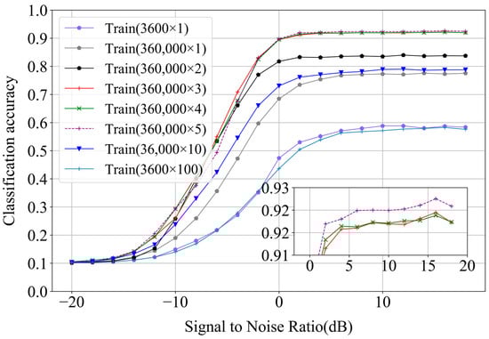 As DL depends on a massive volume of data, the characteristics learned at the front end of the network are entirely derived from existing data. As the amount of data used for learning increases, it is possible for the neural network to learn additional and superior characteristics by obtaining significantly greater amounts of information. Therefore, two sets of experiments were performed to examine the effect of the database size on the network performance by enhancing the dataset with the magnitude warping method as an example. First, 360,000 samples were randomly selected from the original dataset as the training set. The training set samples remained unchanged and different small equal scale factors were used to enhance the training set. In the second group, the original data sizes of 3600 and 36,000 were selected to be enhanced 100 times and 10 times, respectively. The corresponding relationship between the equal scale factor and the data size is shown in Table 2. The results are shown in Figure 7. It could be seen that the total number of samples had a significant impact on the performance of modulation recognition. When the training dataset was only 3600, the training model could not learn more potential features, resulting in less than a 60% accuracy of the signal recognition and poor recognition results. When N was between 1 and 5, the recognition accuracy gradually increased with an increase in the scale factor N. When N = 5, the overall recognition accuracy of the signal reached 93%. However, it could be seen—from the results when the original dataset was expanded 100 times and 10 times—that when the scale factor was too large, the signal recognition accuracy only weakly improved; it was also accompanied by a decrease in the recognition accuracy. We proved, through two sets of experiments, that the method could effectively improve the recognition accuracy of the modulated signals under small sample conditions with a constant scale factor.