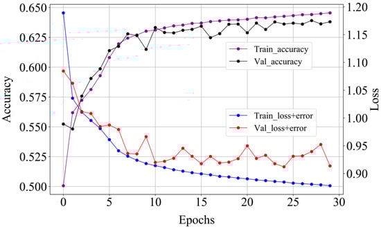 Analyzing from the model perspective, Figure 8 shows the relationship between the loss value and the accuracies with the number of iterations. When the number of iterations increased, the recognition accuracy improved and the loss value of the function gradually decreased, which indicated that the convergence of the model was satisfactory. The loss function curve of the training set was still falling when the training count reached 30, but the validation set had an upward tendency. This indicated that if the model continued to be overfitted by the training, the model had stabilized at this time. It was demonstrated that the network model designed in this paper reasonably generalized that it could be applied to the modulated signal identification problem.