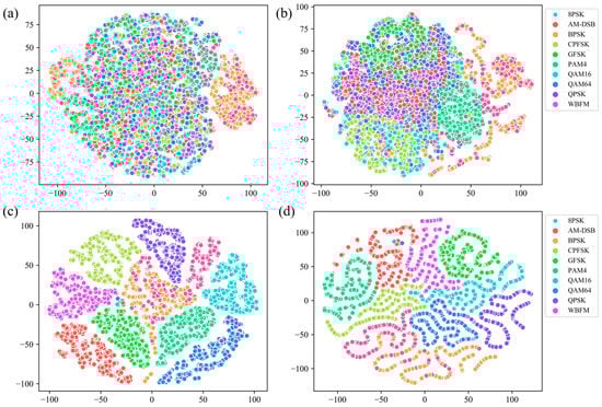 T-SNE data visualization distribution of 10 modulated signals. (a) Raw data distribution; (b) layer 11 (CNN) output; (c) layer 14 (LSTM) output; (d) layer 18 (SoftMax) output.