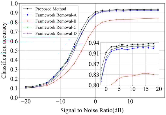 We established four independent modules to discuss the impact of the different modules on the overall structure, which were Framework-A (which removed the independent channel parts from the overall framework), Framework-B (which removed the LSTM), Framework-C (which removed the FC), and Framework-D (which removed the convolution modules). The experimental results showed that the removal of the LSTM module led to a significant decline in the recognition performance (Figure 10), indicating the importance of time modeling for the input data. The combined model recognition results showed that the advantages of each module were complementary; more feature information could be extracted and the accuracy of the signal modulation recognition was effectively improved.