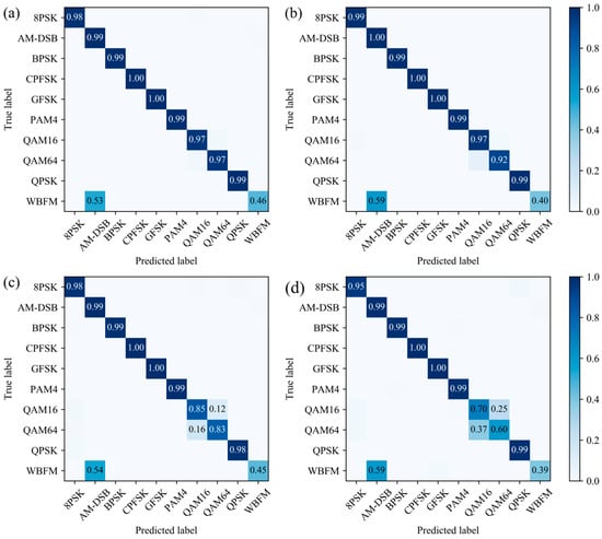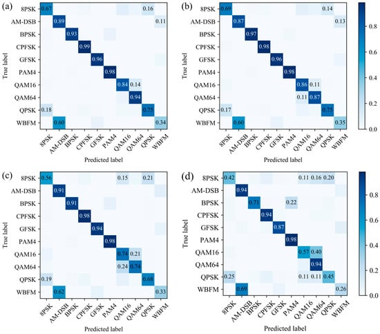 Figure 11 and Figure 12 represent the comparison plots of the confusion matrix obtained from the small sample training set processed by the three data augmentation methods and the original training set after the model at signal-to-noise ratios of −2 dB and 18 dB. The diagonal values in the figure indicate the recognition accuracy of the corresponding signal; the signal recognition accuracy improved as the signal-to-noise ratio increased. Figure 11d shows that the QAM64 and QAM16, as well as the WBFM and AM-DSB, signals were confused for reasons explained in the literature [10,20]. WBFM and AM-DSB both belonged to the continuous modulation and the obvious features between them were very weak in the complex panels. The WBFM and AM-DSB data in the dataset were generated by sampling analog audio signals and the small observation window of both signals (0.64 ms modulated speech per sample) led to a low information rate that was prone to silence between words, making the situation worse and more difficult to identify. When distinguishing between QAM16 and QAM64, only a few symbols could be seen from the short observation time. Moreover, the constellations of the two were of a higher order and had something in common, which made it difficult to distinguish the two signals. It was also the main reason why the overall recognition accuracy reached 93%, with an impossibility of further improvement. However, as seen in the figure, the three methods of scaling, magnitude warping, and time warping all improved the level of confusion between QAM64 and QAM16 to increase the recognition accuracy of both signals, in which scaling had the highest performance. Overall, for all modulation classes, there were three data augmentation methods that could better solve the confusion problem of QAM16 and QAM64 and thus improve the recognition accuracy of the signals.