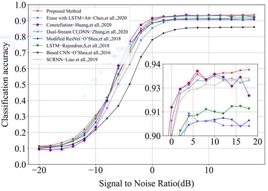 Comparison of recognition accuracy of models under different SNRs [11,12,13,14,16,17,18].