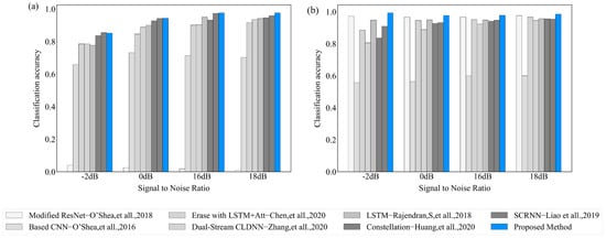 Comparison of recognition accuracy of QAM16 and QAM64 with different models. (a) QAM16; (b) QAM64 [11,12,13,14,16,17,18].