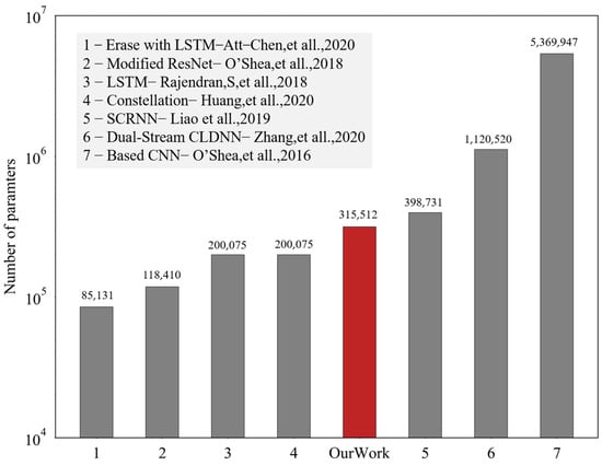 To demonstrate the effectiveness of the combination of data augmentation and the spatiotemporal multi-channel learning framework, we compared the proposed approach with six existing network models [11,12,13,14,16,18]. All of the above classifications were balanced and used the RadioML2016.10 b dataset; the results are shown in Figure 13. In this paper, we combined data augmentation methods with multiple neural network models (CNN, LSTM, and DNN) and designed three channels of parallel input data to achieve the feature fusion. Only half of the samples in the training set were required for training, achieving a maximum recognition accuracy of 93.68%. Moreover, the confusion problem of QAM16 and QAM64 was eliminated and the recognition accuracy of the two signals was highest, as shown in Figure 14, when comparing the proposed algorithm with the above six algorithms. From the perspective of the computational complexity, as shown in Figure 15, the recognition accuracy of both reference [11], which involved the most parameters, and reference [12], which had the least parameters, failed to achieve rational results. The model designed in this paper involved 315,512 parameters, with relatively few parameters, and was always at a high level in terms of the recognition accuracy. The comprehensive comparison results are shown in Table 3. Compared with the previous work, our work had a medium model complexity and better results in the overall recognition accuracy and confusion degree of QAM16 and QAM64.