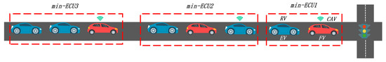 As is shown in Figure 1, the design of the min-ECU divides thr vehicle platoon into different units, which facilitates the independent optimization of the speed profile and passing scheme of each min-ECU. This distributed structure will reduce the difficulty of CAV speed trajectory optimization and improve the calculation efficiency. In addition, the min-ECUs could have various combining forms, which can the fulfil the vehicle platoon control requirements under different penetrance of RV and CAV. Moreover, by recombining and splitting multiple min-ECUs, the platoon’s cooperative control could be realized with regards to different traffic scenarios (such as intersection scenarios) to achieve the control of the whole traffic flow condition.