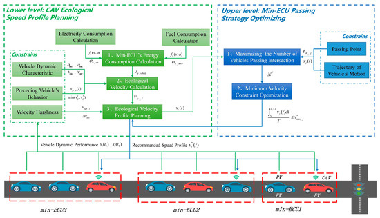 To alleviate intersection congestion and energy waste during vehicle operation, this paper proposes a bi-level control model based on min-ECUs, which aims to improve the efficiency of a vehicle platoon and reduce energy consumption. Specifically, considering the preceding vehicle’s behavior, velocity hardness and vehicle dynamic performance, the model firstly minimizes the energy consumption of a min-ECU by optimizing the speed profile of the head CAV, and then properly improves the whole vehicle platoon’s efficiency by adjusting the speed profile of partial min-ECUs which would pass the intersection in the next green period. In addition, in order to simplify the model, this paper only studies the control of vehicles in a single lane ignoring the behavior of a changing lane and overtaking, i.e., the vehicle couldn’t overtake the front vehicle.