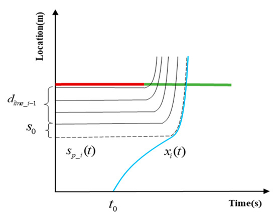 In Figure 3, denotes the headway when vehicles are queuing, represents the distance between the position of the preceding vehicle and the parking line, which can be obtained easily under an intelligent connected environment. A fictitious vehicle following the preceding one is defined, which is far away from the parking line. It is apparent that a CAV trajectory (as the blue line in Figure 3)would not operate under a safe condition unless its trajectory does not exceed the fictitious one’s, i.e., .
