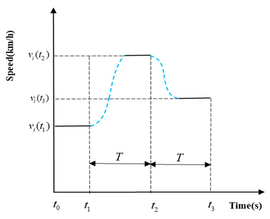 where is the velocity of a vehicle after optimization by the trigonometric function; is the mean target velocity and ; is the result of Equation (7) and is named the target velocity; is the difference between the vehicle’s average target velocity and its initial velocity , i.e., ; is the rate of change of acceleration/deceleration when the velocity of a vehicle is between ; , is the rate of change of acceleration/deceleration when the speed is below and . is the rate of change of acceleration, which satisfies: