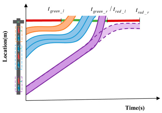 In addition to velocity and acceleration, the preceding vehicle’s behavior including queuing and normal operation is also considered. In this paper, the behavior of the preceding vehicle at an intersection is regarded as a constraint to the following min-ECU. Referring to the method of [27], a static path constraint (i.e., the constraint of a red period) is given when the preceding vehicle is queuing. As is shown in Figure 3, a CAV and its following RVs could not negotiate an intersection until the queue releases when the preceding vehicle is queuing, thus the behavior of a CAV is constrained by the process of the downstream vehicle’s queuing. Essentially, the static path constraint represents the impact of the red period in the signalized intersection on the CAV, which is defined as: