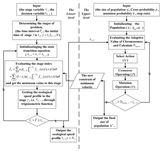 As is shown in Figure 6, for the lower-level model, the time interval is divided into stages with the same time length. Taking the whole energy consumption of a min-ECU as the stage index, finally the best ecological speed profile is calculated and conveyed to the upper-level. The upper-level utilizes the passing points of the min-ECUs to judge the possibility of a min-ECU traversing an intersection, then creates a new minimum velocity constraint for these min-ECUs whose passing points are during the red period to make them pass the intersection by accelerating to some extent. The new constraint will be conveyed to the lower-level to re-optimize the ecological speed profile.