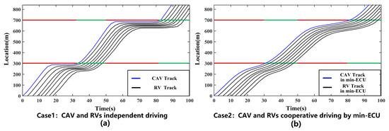Considering the impact of different proportions between FV and EV within a min-ECU, time–space diagrams under three kinds of proportions, including 1:1, pure FV and pure EV, are shown in Figure 9. On the one hand, as is shown in Figure 9b, when EVs reach the intersection under the best ecological speed profile, there will be a deceleration, and subsequently the velocity will be increased to the best ecological velocity until the EVs pass the signalized intersection. The operational strategy of EVs depends on the kinetic energy recovery while baking. Thus, to some extent, the behavior of braking aims to ensure the ecological property. On the other hand, in Figure 9c, which relates to a pure FV min-ECU, fuel consumption is closely related to acceleration and deceleration, thus the vehicles traverse the successive intersections with a constant velocity taking advantage of the green wave band to decrease energy consumption.