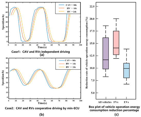 The curve of velocity when a min-ECU negotiates successive signalized intersections. (a) CAV and RVs independently driving, (b) CAV and RVs cooperatively driving by a min-ECU, (c) box plot of vehicle operation energy consumption reduction percentage.