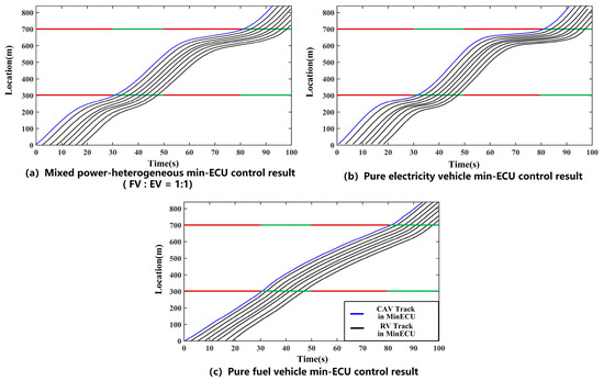 The space–time diagram under different proportions of FVs and EVs. (a) Mixed power-heterogeneous min-ECU control result (FV:EV = 1:1). (b) Pure electric vehicle min-ECU control result. (c) Pure fuel vehicle min-ECU control result.