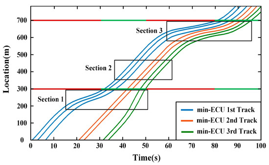 As is shown in the Section 1 of Figure 10, by optimization of the upper-level model, the third min-ECU will get through the intersection during the previous green period with a reasonable acceleration strategy, while the other two min-ECUs will pass the intersection according to their best ecological operation scheme. After traversing the intersection, all the min-ECUs keep a constant velocity, i.e., the best ecological velocity as is shown in Section 2. At the same time, it can be noted obviously in Section 3 that when the three min-ECUs encounter the next signalized intersection, all the min-ECUs will decelerate appropriately to pass the intersection to form a big vehicle platoon. This operation scheme verifies the effectiveness of the upper-level model in the proposed ECU-CACC, which could improve the traffic efficiency of a single intersection.