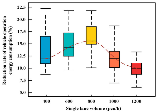 As the release of vehicles follows a Poisson distribution, in the low flow condition, some RVs’ operation almost wouldn’t be affected by CAVs, because the sparse traffic flow allows a long distance between vehicles. Under this condition, partial vehicles couldn’t form min-ECUs and their operation could not be optimized by the proposed model. So during the beginning of the vehicles’ release, the energy reduction performance of the ECU-CACC is inconspicuous for the vehicles operating independently. With an increasing number of vehicles, the operation of one vehicle would be limited by the vehicles around it, i.e., the interaction behaviors among vehicles is more and more outstanding, so the influence of a CAV’s behaviors on RVs becomes gradually obvious. In this condition, the model proposed in this paper would play a role in the optimization of velocity and passing strategy step by step, and the effectiveness of the model will reach its optimum when the traffic flow is increased to a certain extent. As is shown in the Figure 11, a single lane volume with 800 pcu/h obtains the highest reduction of energy consumption. But in the wake of further increasing of the number of vehicles, the behavior of vehicle queuing is more and more obvious, which would limit the vehicles’ operation speed further, and the control effectiveness of the ECU-CACC will then be discounted heavily. Thus, we conclude that the control effectiveness of the ECU-CACC is limited by the condition of traffic flow volume. But, at a holistic level, the ECU-CACC proposed in this paper could still decrease energy consumption under different transportation demands.