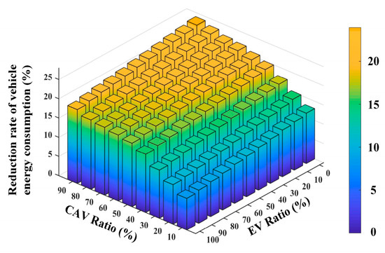 In addition, the influence from the mixed proportion of CAVs and RVs, and EVs and FVs is analyzed through fixing the traffic flow with 800 pcu/h, and the result is shown in Figure 12. Under the same proportion of EVs and FVs, the higher CAV penetrance results in a higher energy consumption reduction, because the more CAVs, the more controllable vehicles in the research region, the more prominent an impact on RVs under some traffic flow conditions, thus the better ecological control effectiveness of the ECU-CACC. At the same time, with the same CAV proportion, the higher the FV penetrance, the better the ecological control effectiveness, because compared with EVs, the energy consumption of FV is affected remarkably by accelerating, decelerating and idling events, which are the common events at a signalized intersection. Under this situation, the proposed ECU-CACC could provide a better control effectiveness by optimizing the best ecological speed profile of min-ECUs to avoid unnecessary fuel consumption. In addition, as is shown in Figure 12, there is still an energy consumption reduction rate ranging from 10% to 20% under a pure EV environment, although the driving of EVs is less affected by the signalized intersection.